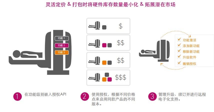 當(dāng)您將功能級授權(quán)以及打包能力搭建到硬件產(chǎn)品目錄中時,即可真正提升單個硬件設(shè)備在大量多樣化市場中的總體可用性。停用或移除“基本”版本設(shè)備的高級功能意味著能以更低的價格提供該設(shè)備,從而贏得低端市場。或者,設(shè)備供應(yīng)商也可以對一些為高端客戶或縫隙市場提供附加價值的高級功能收取額外費用。有一點是確定無疑的,醫(yī)療設(shè)備供應(yīng)商若不具備將硬件及解決方案各項功能貨幣化的能力,其市場適用性或產(chǎn)品定價會受到極大限制,這也等同于喪失了收入機會。