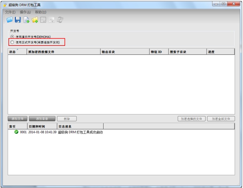 2. 運(yùn)行超級狗 DRM 打包工具(<超級狗安裝目錄>\Tools 目錄下的 dataencrypt.exe),加密要保護(hù)的 Office 文檔和 PDF 文檔。