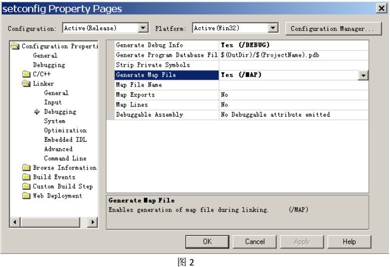 使用 Microsoft Visual Studio .NET 2003, 或 Microsoft Visual Studio(版本號(hào)為 2005,2008, 或 2010)其中任意一個(gè)編輯器打開(kāi)一個(gè)已有的 Microsoft Visual C++工程,在菜單欄中選擇: Project——Properties,這將打開(kāi)工程的 Property Pages 對(duì)話(huà)框, 請(qǐng)選擇Configuration Properties——Linker——Debugging,在選項(xiàng) Generate Map File 處選擇:“Yes(/MAP)” (如圖 2) ,點(diǎn)擊確定按鈕, 然后重新編譯整個(gè)工程, map 文件將與 exe 文件生成到同一目錄中。
