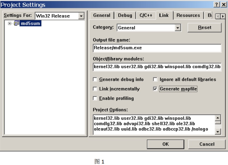 使用 Microsoft Visual C++ 6.0 打開(kāi)一個(gè)已有工程, 在菜單欄中選擇: Project——Settings,這將打開(kāi) Project Settings 對(duì)話(huà)框, 請(qǐng)選擇 Link 選項(xiàng)卡,勾選選項(xiàng): “Generate mapfile”(如圖 1) , 點(diǎn)擊確定, 然后重新編譯整個(gè)工程, map 文件將與 exe 文件生成到同一目錄中。