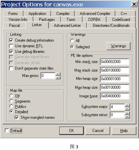 使用 Borland C++Builder 6 打開(kāi)一個(gè)已有的 C++工程,在菜單欄中選擇: Project——Options,這將打開(kāi)工程的 Project Options 對(duì)話(huà)框, 請(qǐng)選擇 Linker 選項(xiàng)卡,在 Map file 分組框中選擇選項(xiàng):“Detailed” ,并勾選選項(xiàng):“Show mangled names” (如圖 3),點(diǎn)擊確定按鈕,然后重新編譯整個(gè)工程, map 文件將與 exe 文件生成到同一目錄中。