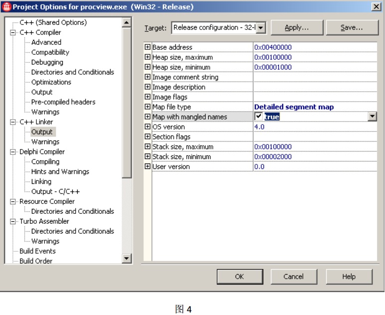 使用 Embarcadero® C++Builder®(XE, XE2 或 XE3)其中任意一個(gè)編輯器打開(kāi)一個(gè)已有的 C++工程,在菜單欄中選擇: Project——Options,這將打開(kāi)工程的 Project Options 對(duì)話(huà)框, 選擇 C++ Linker——Output,在選項(xiàng) Map file type 處選擇:“Detailed segment map”,并勾選選項(xiàng):“Map with mangled names”(如圖 4),點(diǎn)擊確定按鈕,然后重新編譯整個(gè)工程, map 文件將與 exe 文件生成到同一目錄中。