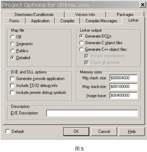 使用 Borland Delphi 7 打開(kāi)一個(gè)已有的 Delphi 工程,在菜單欄中選擇: Project——Options,這將打開(kāi)工程的 Project Options 對(duì)話(huà)框, 請(qǐng)選擇 Linker 選項(xiàng)卡,在 Map file 分組框中選擇選項(xiàng):“Detailed” (如圖 5),點(diǎn)擊確定按鈕,然后重新編譯整個(gè)工程, map 文件將與 exe 文件生成到同一目錄中。