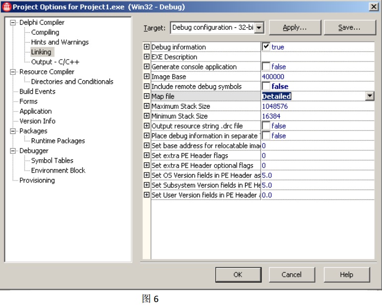 使用 Embarcadero® RAD Studio(XE, XE2 或 XE3)其中任意一個(gè)編輯器打開(kāi)一個(gè)已有的 Delphi 工程,在菜單欄中選擇: Project——Options,這將打開(kāi)工程的 Project Options 對(duì)話(huà)框, 選擇 Delphi Compiler——Linking,在選項(xiàng) Map file 處選擇:“Detailed”(如圖 6) ,點(diǎn)擊確定按鈕,然后重新編譯整個(gè)工程, map 文件將與 exe 文件生成到同一目錄中。