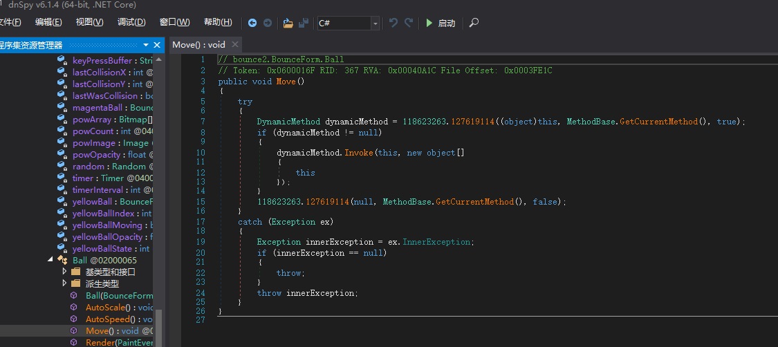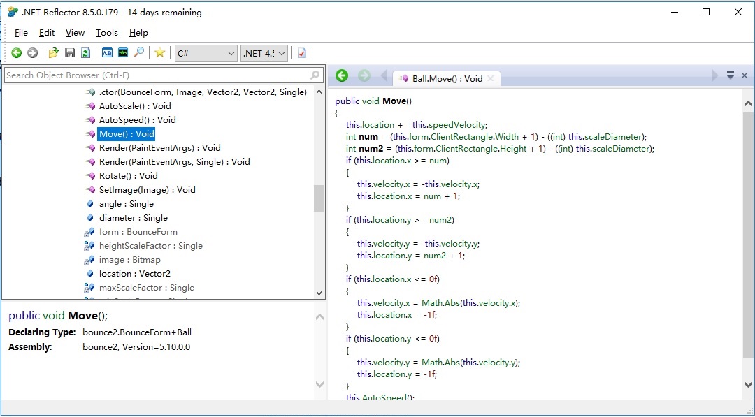 把dot_NET2_bounce.exe拖進(jìn)反編譯工具.NET Reflector 8.5,可以清楚地看到move()方法的代碼。