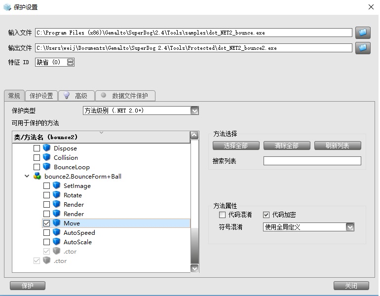 3、用超級(jí)狗外殼工具對(duì)此demo程序進(jìn)行外殼加密,加密時(shí)選擇對(duì)move()做代碼加密。