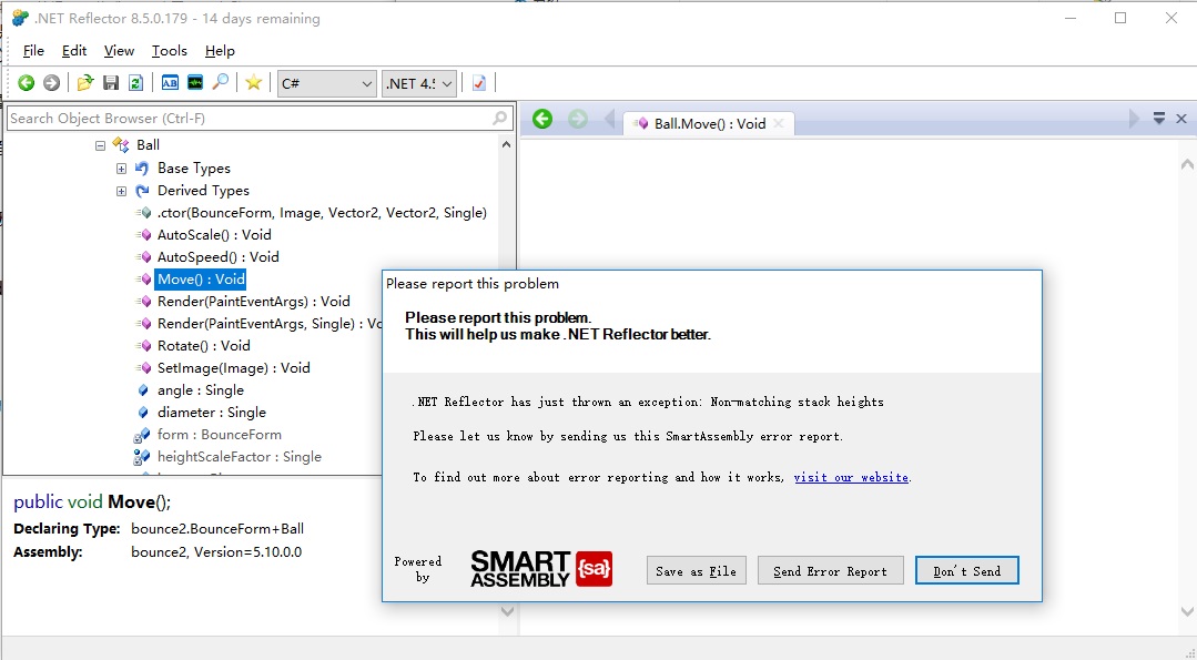 將加密后的程序,拖入.NET Reflector,找到對(duì)應(yīng)的move(),可以看到軟件無法解析該方法,直接報(bào)錯(cuò)。