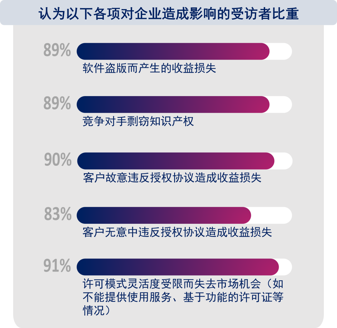 數字時代前進的步伐已勢如破竹,而軟件則承載著各大廠商的核心競爭力,軟件受到侵害,核心競爭力首當其沖。據報告顯示,90%的廠商擔心軟件會遭到侵害,據估計,其中有超過四分之一的軟件未經許可被濫用或盜用,導致效益、競爭力、業務機會等方面的利益受損。然而,維系客戶關系仍是軟件廠商未來長期收入的“黑馬”,如何在保護自身知識產權的同時還能夠打造可持續的業務收入模式,平衡二者關系成為了軟件廠商需要面對的挑戰。