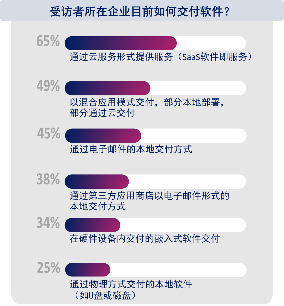 報告中,很多受訪者所在企業認為SaaS模式對未來業務具有積極促進作用,并且已經開始通過云來提供SaaS服務。其實,對比本地部署軟件的 “一次性永久”的交付和銷售模式,SaaS交付所采用的訂閱模式更偏向為一種基于 “關系”的業務模式,它可以讓軟件商與其客戶保持著持久的、緊密的業務聯系,且創造可復購的、可預測的收入流。