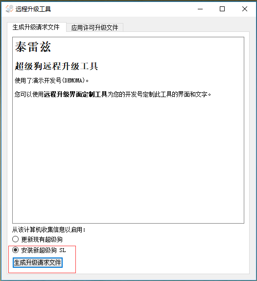 選擇【安裝新超級(jí)狗SL】,并點(diǎn)擊【生成升級(jí)請(qǐng)示文件】,將會(huì)生成一個(gè)擴(kuò)展名為“c2v”的文件,將此文件發(fā)送給軟件開(kāi)發(fā)商。